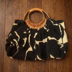 Chic tote bag with a bold black and cream pattern. Features stylish wooden handles. Perfect for everyday use.