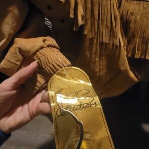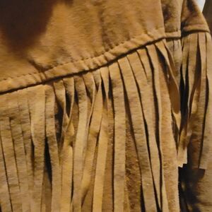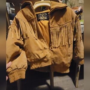 size big kid 6- Genuine leather tan jacket with fringe details all over. can be worn for either boys and girls. summer warm with bottom stretch and sleach stretch to make it warmer. the fringe is so fun and definitely gives a cowboy / hippie look. IT IS VERY WARM! has tags attached as in the photo. unique and can't find anywhere else! never worn.