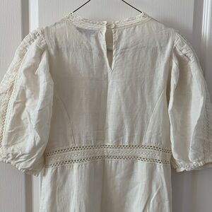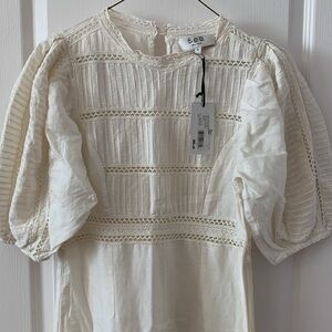 Elegant cream maxi dress with puff sleeves. Intricate lace detailing. Perfect for any occasion.