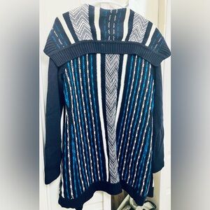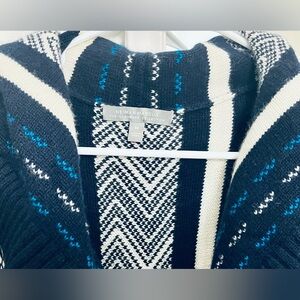 Stylish navy and white cardigan. Features bold stripes and chevron patterns. Perfect for layering. 💯 cashmere. Like new condition.