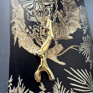 Elegant gold branch pendant on a long chain. Unique and stylish design. Nautical claw clasp. Its sleek design offers a sophisticated touch to any outfit.