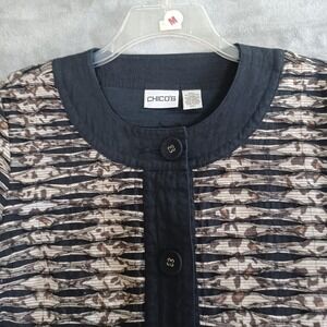 Keywords: Chicos jacket, animal print jacket, button front jacket, cotton blend blazer, womens jacket, size 1, black beige jacket, casual jacket, lightweight jacket, blazer jacket, animal print blazer, chicos blazer, womens blazer