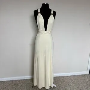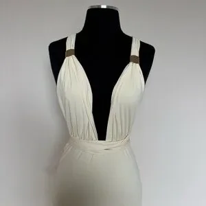 Introducing our Mira Maxi Dress. Featuring a plunging neckline with gathered bust panels, our Mira Maxi Dress is fully adjustable and can be styled multiple ways. Made from our signature buttery soft fabric with an open back, it is fully lined to give you the most flattering silhouette. The gold hardware details have been designed to move along the tie straps in order to adjust bust coverage and to compliment you in all the right places.