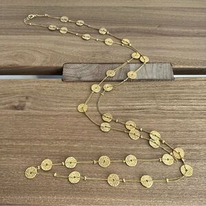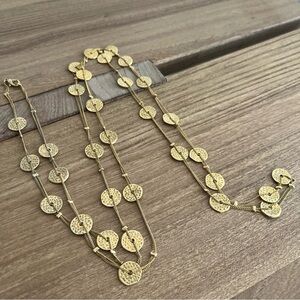The necklace features a long, gold-tone chain with hammered or textured disc pendants. Can be worn double layered.