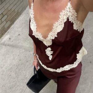 The Kira Top by DÔEN. Crafted from 100% silk, it features ultra-skinny adjustable spaghetti straps, a plunging V-neckline adorned with intricate floral lace, and inset lace detailing at the bodice. Size S. New with tags.