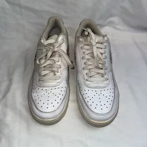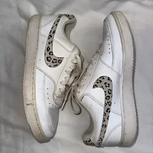 Nike women’s Court Vision Low sneakers in white with a leopard print swoosh
