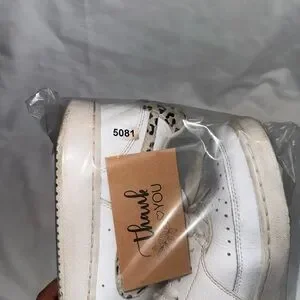 Elevate your style with these chic white sneakers featuring a trendy leopard print accent. Perfect for casual outings and adding a fashionable touch to any outfit.