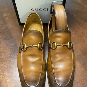 Elegant Gucci loafers in tan leather. Features classic slip-on design with signature detailing. No box or dust bags