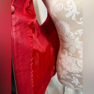 This gorgeous Peter Nygård red genuine leather vest features a sleek zip-front design with beautiful gathered leather trim and large front flap pockets. The back is crafted from soft stretch knit for comfort and a flattering fit. Fully lined, high-quality, and rich in color, this piece adds bold elegance to any outfit. Perfect for layering, Western chic, street style, or luxury casual wear. Size Large.