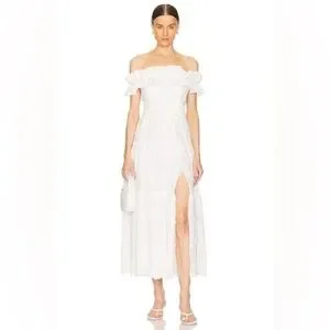 Elegant off-shoulder midi dress. Features ruffle details and side slit. Perfect for special occasions.