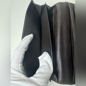 This is a pre owned wallet in good condition. The canvas is clean and leather is clean with some wear. The heart hardware shows sign of wear consistent with the age of the wallet. Snap pocket and heart closure works well. Interior pockets are clean inside. The exterior pocket does show some wear. There is alot of life left in this wallet.