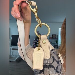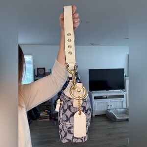 From 2008..No callouts on this Y2K denim and white leather bag with brass hardware that can be used on the shoulder or crossbody for hands free wear. Gorgeous Soho chunky gold tone brass buckle with rivets on the belt.
