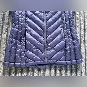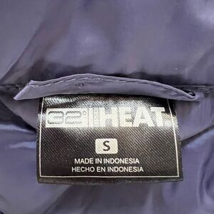 32 Degrees Heat Ladies’ Lightweight Packable Puffer Vest Sz Small, purple/navy, depends on lighting. 2 outside zipper pockets, 1 inner pocket. Exterior 100% nylon, insulation 100% polyester. 19” armpit, 25” long. Made in Indonesia.
