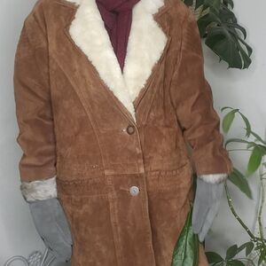 90s Vintage Women's Brown Suede Coat Faux Fur Collar Quilted Interior Pockets