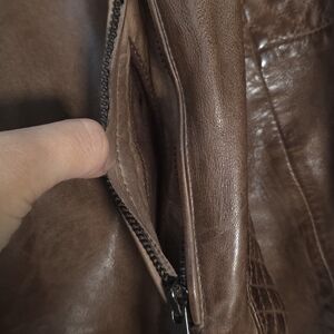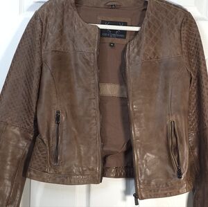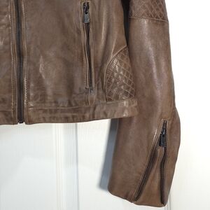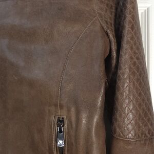 This stunning jacket features a rich brown color with stylish quilted detailing on the sleeves, shoulders, and sides. It has a full front zip closure, zippered cuffs, and front zip pockets for a classic moto look