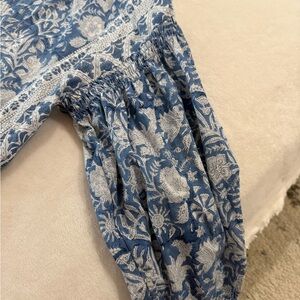 Chic floral blouse in blue and white. Features button details and intricate patterns.