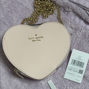 Elegant heart-shaped mini bag by Kate Spade. Soft pink with a gold chain strap. Adds charm to any look.