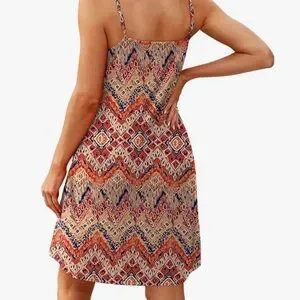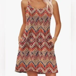 Stylish bohemian dress featuring a vibrant geometric pattern. Includes convenient pockets & adjustable Spaghetti Straps