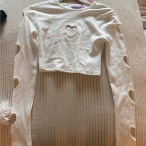 Trendy white crop top with heart cutouts. Long sleeves add elegance. Ideal for casual or night events.