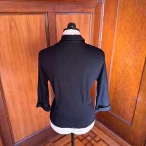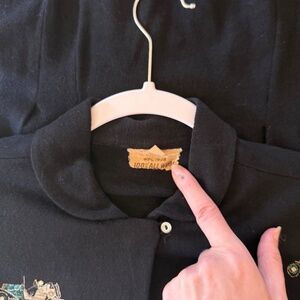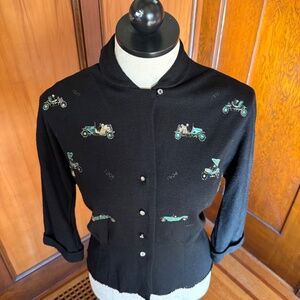 This is a really special and rare 1950s blouse with a print of antique automobiles at the front. The cars are in bright aqua, gold, and white with tiny prong set rhinestone accents on black wool fabric. Years ranging from 1904-1910 are scattered throughout print as well. Small rounded peter pan collar with a small button to keep it in place, front rhinestone buttons, slight dolman sleeves with cuff, and a raw hem (meant to be tucked in, does not fray). Very good vintage condition overall. Some light cracking to the auto print, and once small mend near the shoulder. Size: Marked 36. Fits like a Large