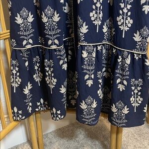 Elegant navy blue dress with intricate white floral patterns. Perfect for any occasion. Missing the belt but easily can be paired with other belts or no belt at all. Half lined.