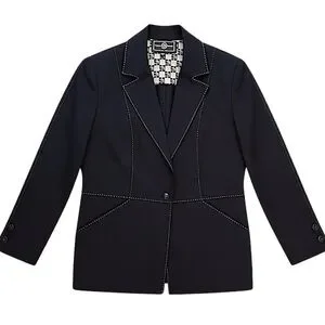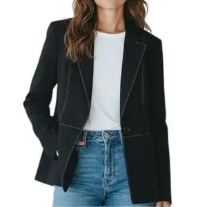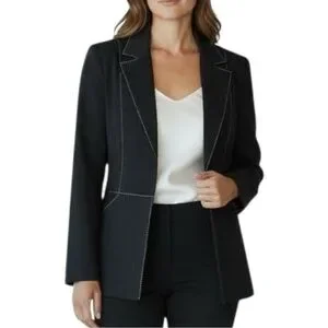 A sophisticated St. John Sport blazer crafted with the brand’s signature precision tailoring. This black structured jacket features elegant contrast topstitching and a refined logo-printed interior trim—an effortlessly polished piece for elevated workwear, evening styling, or a modern minimalist wardrobe.