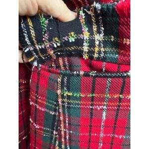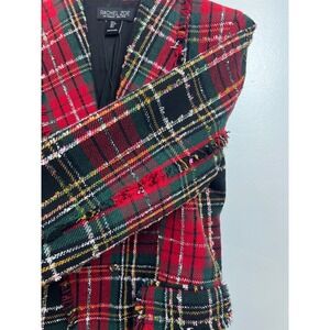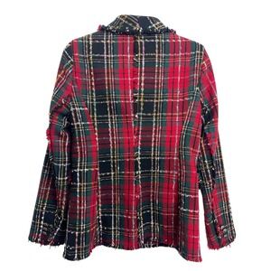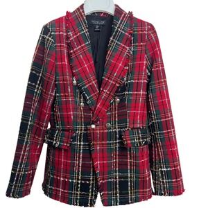Rachel Zoe plaid tweed blazer in a striking red green and black pattern with metallic threads and frayed fringe details. Features a classic double-breasted silhouette with ornate gold-tone buttons and flap pockets. Elevate your look for holiday gatherings or add a chic touch to a night out.