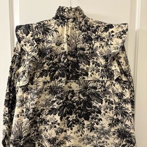 Gorgeous Tuckernuck blouse with ruffles at shoulder and pearl snap buttons. Perfect for the office or can be dressed up for a date night. Note - right cuff seems to have a dye transfer from the pattern. This was the condition I received the blouse in and is not noticeable except from up close.