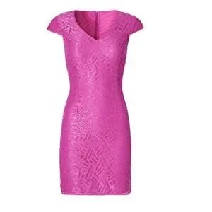 Fuchsia Lace with Silver Lurex Thread (70% Cotton, 30% Metallic). Cap sleeves. V- neckline. Shift body. Hidden back zipper with hook-and-eye closure. Lined. 35” from shoulder to hem. Imported.