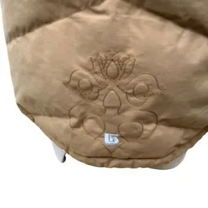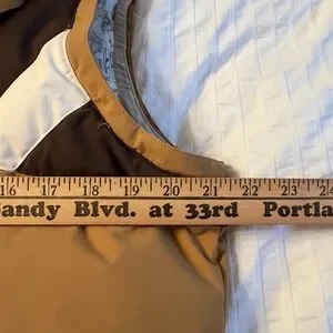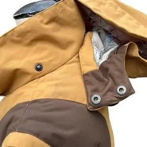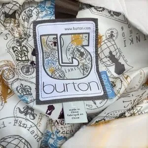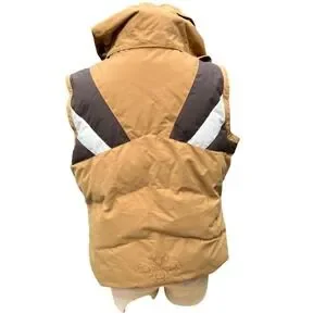 Stylish Burton vest. Features brown and cream colors. Sleeveless with a hood. Front button closure. Perfect for layering.