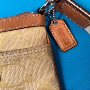 Chic Coach crossbody with signature pattern. Adjustable strap for comfort. Ideal for daily wear. See wear on corners.