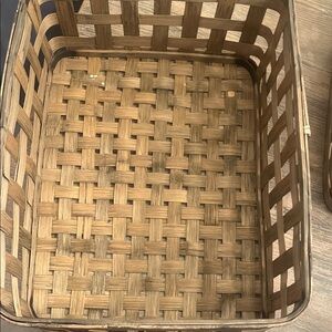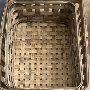 Enhance your home decor with this rustic brown woven basket set. The set of 3 nesting baskets goes great with the flatter one. There are a couple of scratches but no broken spots. Excellent condition.