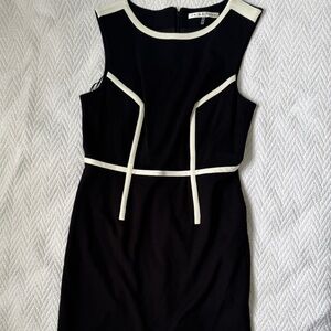 Trina Turk black ponte with ivory trim sheath dress in size 8 . A professional and classic look for work. Lace-trimmed lining, vent slit in the back.