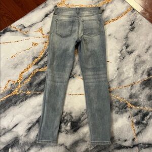 Trendy light gray skinny jeans with stylish distressing. Ideal for casual wear.