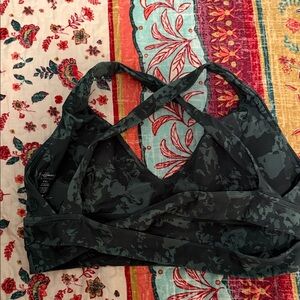 Elegant dark floral design. Cross-back straps for support. Ideal for active wear.