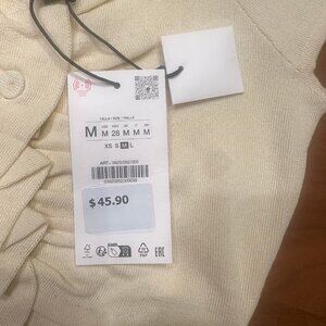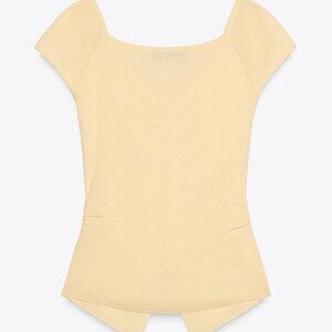 ZARA ribbed knit top in pale yellow with front ruching and fabric-covered button detail. Short sleeves with a fitted silhouette. Size Medium. New with tags.