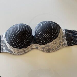 NWOT Victoria's Secret Strapless Black & White polkadot floral lace trim 38DDD