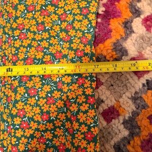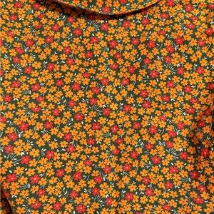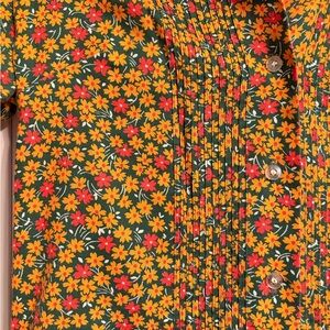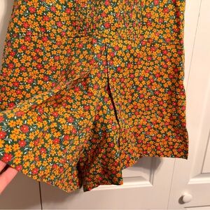 Adorable vintage romper with a skort style at the bottom. Yellow, orange, and green daisy pattern. Buttons down the front. From the 60s or 70s.