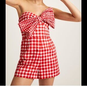 Stylish strapless romper with gingham pattern. Features a bold bow accent. Ideal for casual outings.