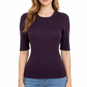 Features: Elevate your professional wardrobe with this classic Harvé Benard by Benard Holtzman piece. Featuring a rich plum hue and a flattering vertical ribbed texture, this 3/4 sleeve top is crafted from a soft wool blend. Perfect for layering under a blazer or wearing solo for a polished, minimalist look.