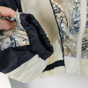 Vintage 80s cream, metalic silver and gold, blue, pink East West windbreaker zip front jacket is a women's size Large.