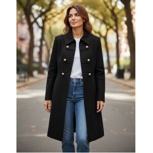 Elegant black military style coat with gold buttons. Paired with black pinstripe pants. Perfect for a sophisticated look.