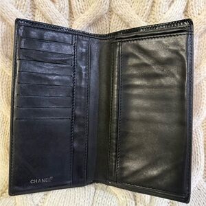 Elegant Chanel series 7 black patent leather wallet with quilted design. Interior is buttery soft lamb skin and includes a zippered pouch. Wallet shows signs of use throughout. Dulling of patent leather, loss of shape, interior wear on card slots, coin residue, scratches on hardware. COA can be done if requested when purchased and it will extend the shipping process by two business days.