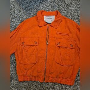 This vibrant orange utility jacket by Cartonnier features a lightweight design and a sporty cropped fit, making it a standout piece for any casual ensemble. Its relaxed silhouette and bold color ensure both comfort and style.