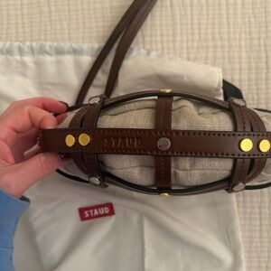 Great condition - Leather: Cowhide. Caged silhouette with two-tone stud accents. Linen canvas lining with zip at top. Adjustable strap. Textile lining. Weight: 11oz / 0.31kg. Imported, Vietnam. Measurements: Height: 6.25in / 16cm Length: 10.75in / 27cm Depth: 4.25in / 11cm Strap drop: 15.75in / 40cm