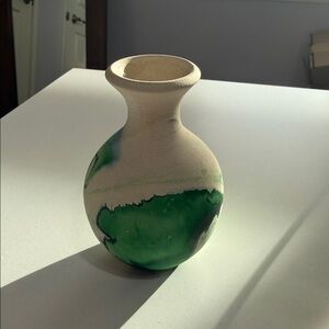 This item is a Nemadji pottery vase featuring a green marbled swirl pattern on a white clay body.
