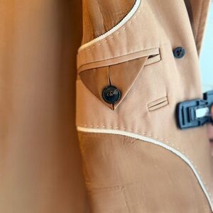 Elegant beige coat with classic collar. Crafted from Italian fabric.