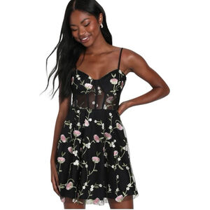 Lulu’s Naturally Charming, black, floral, embroidered, bustier mini dress. Lightweight mesh fabric with floral embroidery overlays a black lining. Adjustable spaghetti straps. Sheer panel above the fitted waist. Skirt is lightly pleated and a skater style. Hidden zipper in back. Brand new with tags. Retail $77.