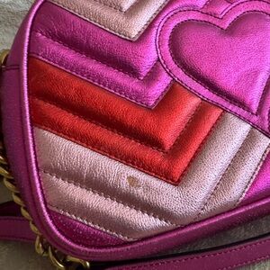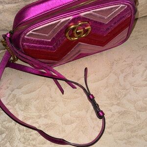 Stylish and vibrant, this FAKE Gucci women's bag features a striking pink and red chevron design. Perfect for adding a pop of color to any outfit! see pictures for signs of use, there is nick on the back of the purse and the strap of the bag has some indents as pictured above. looks and feels real! make me an offer :)
