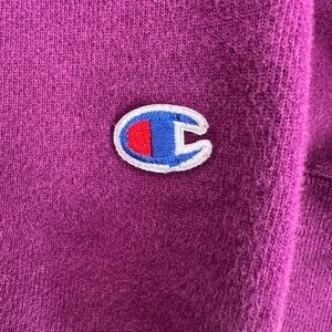 Cozy Champion hoodie in rich purple. Features front pocket and drawstring hood. Perfect for casual wear.